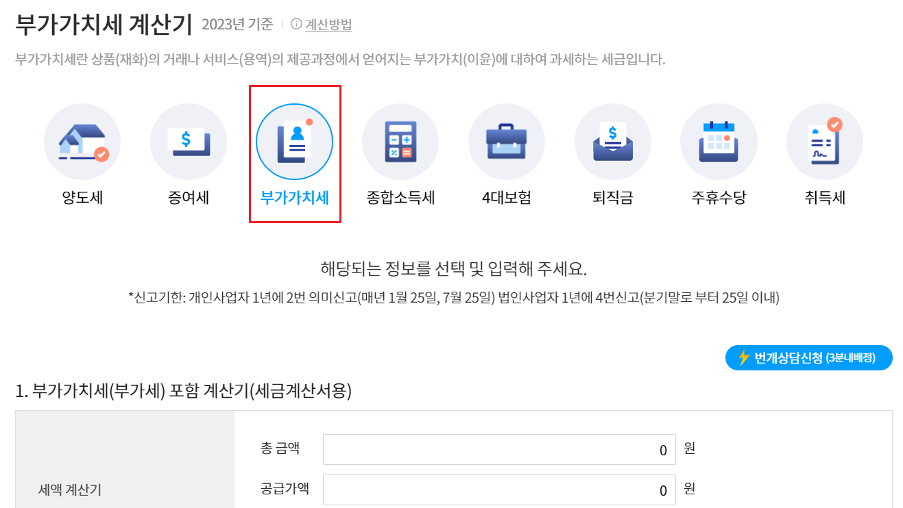 신고 기간인 1월 1일 ~ 1월 25일까지 신고 납부해야 할 부가가치세를 먼저 부가세계산기로 알아보세요.