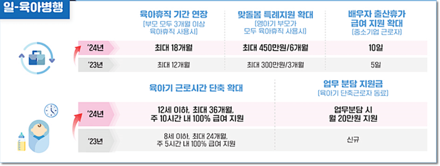 ● 2023년 최대 1년 3+3 부모육아휴직제 → 2024년 1년 6개월 6+6