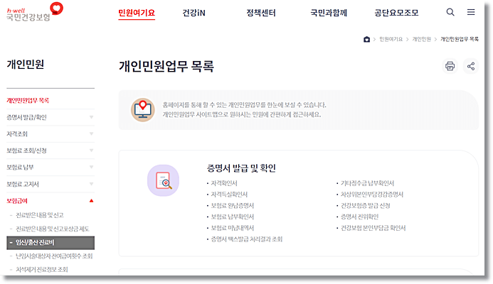 민원 요기요 > 개인민원> 보험급여> 임신/출산진료비 온라인 신청
