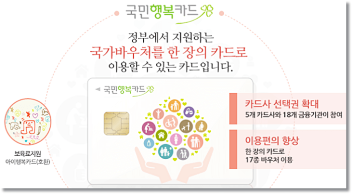 국민행복카드를 통해 현금이 아닌 바우처 형태로 제공되며 이를 이용하여 지원금을 사용