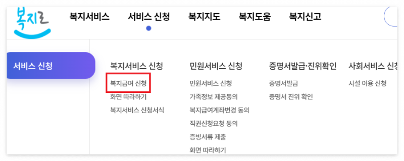 - 복지로(www.bokjiro.go.kr)에서 신청